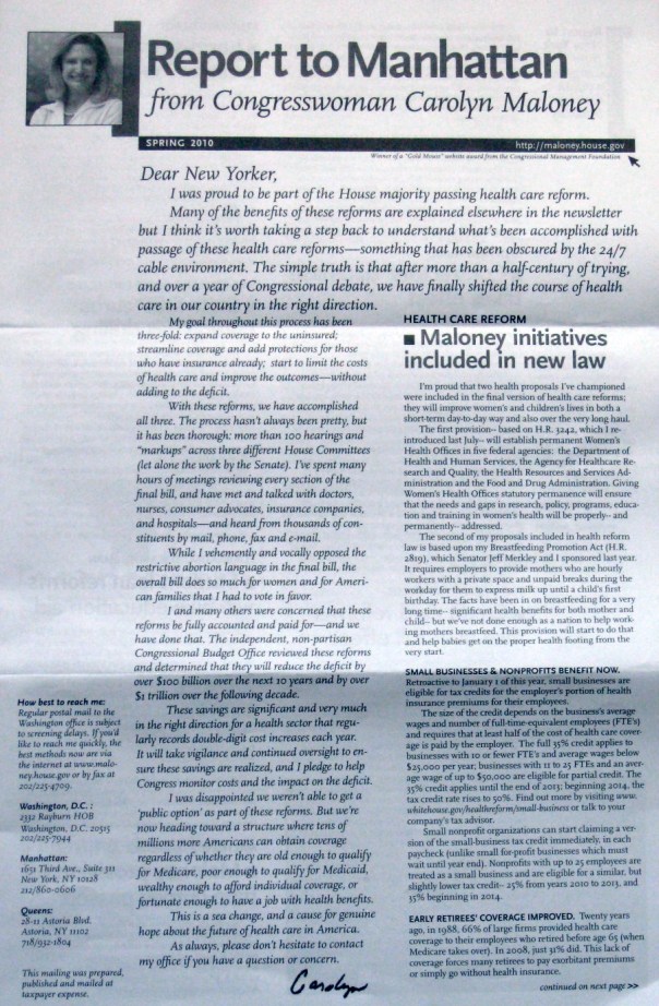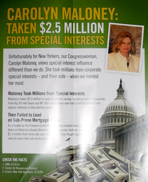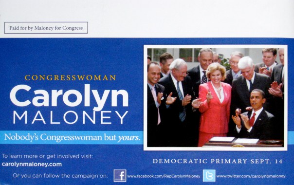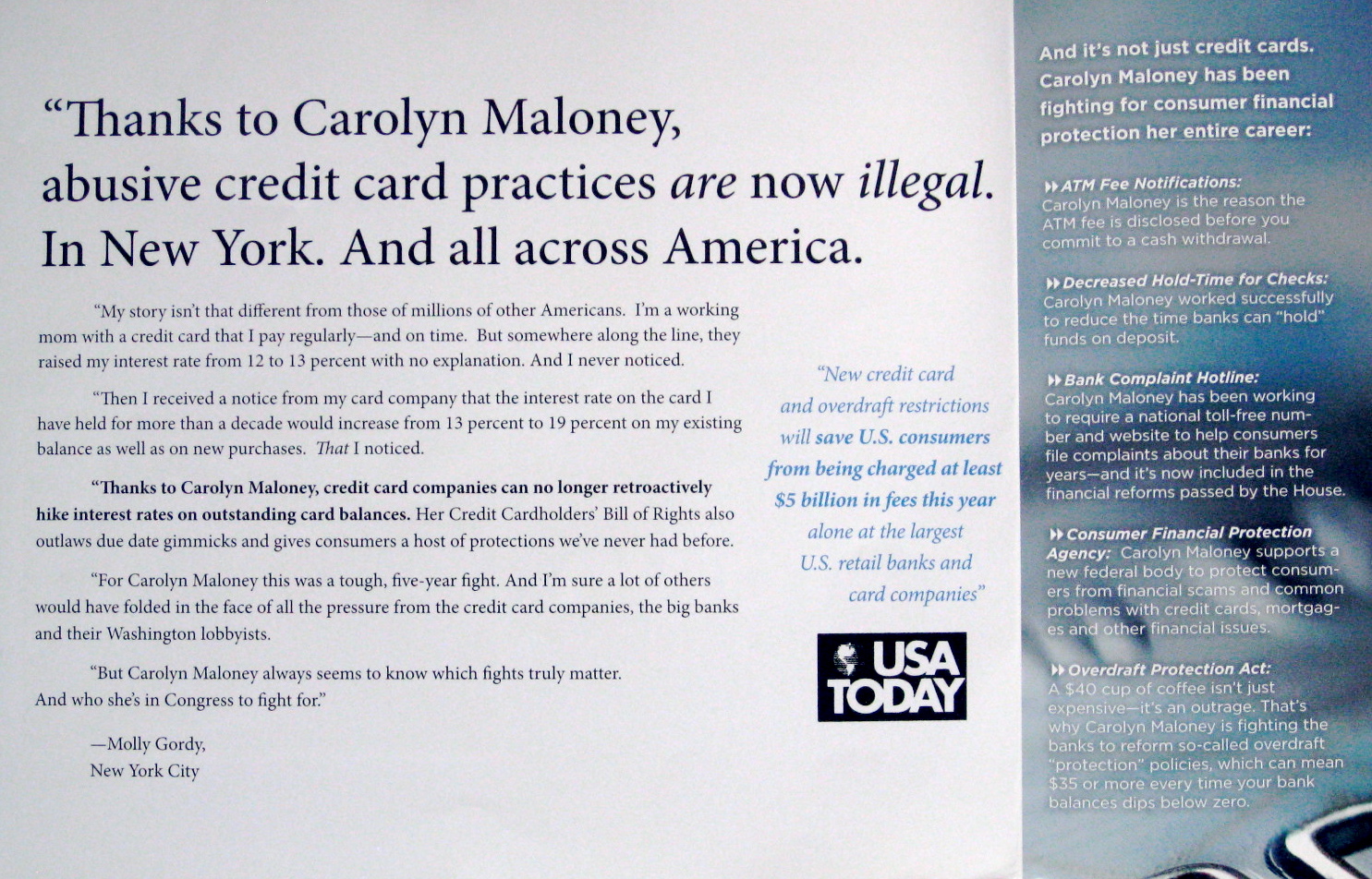Don’t get me wrong. Maloney, who thought better of running against Gillibrand for Senate this year, has been in the House since around the time Bill Clinton came to town and has been an effective member in many ways. Most recently, she was the momentum-building champion of the credit card reform act that passed with a true bipartisan 357-70 vote in the House and led the way for the Senate to (for once) pass its bill, which is the version that ultimately became law. You’ve probably seen some of its effects laid out in your statements this year.