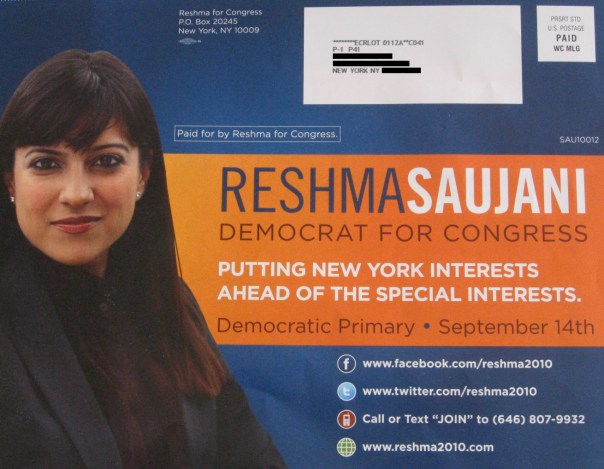Of course, during my walks up the stairs I have also been thumbing through Maloney’s would-be replacement for her seat in New York’s 14th district, Reshma Saujani. Her family’s story has all the trappings of a riveting immigrant struggle against all odds that compels her to help others as a Yale-educated lawyer. Her super-smooth-and-shiny direct mail pieces tout her unwillingness to take money from special interests and her commitment to defending immigrants, reminding us once again, that yes, this isn’t Arizona. They also feature the now de rigueur unflattering picture of her opponent; in this case a shot of a bloated-looking Carolyn Maloney.