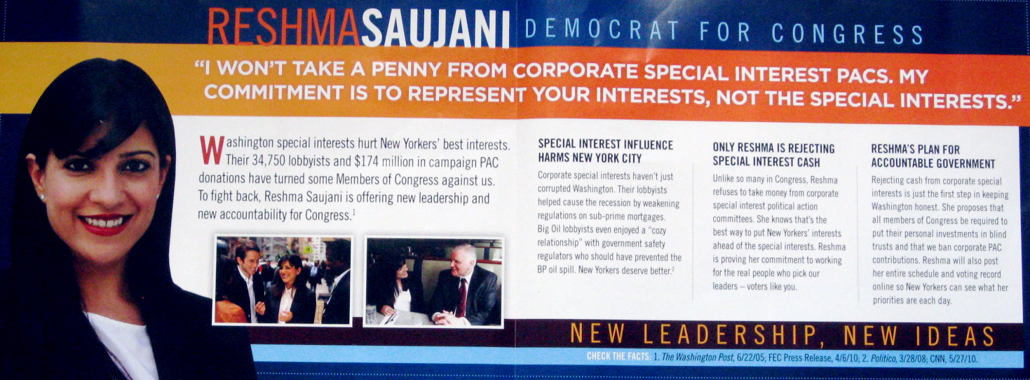 Moreover, a couple of the things Saujani implies are murky or disingenuous. Yes, she isn’t taking corporate PAC money, but that is just money that employees give to their companies to donate to candidates that the firm deems worthy. It puts a corporate middleman between original donors and recipients. Those employees are still welcome to donate directly to Saujani… and they do. “For the first three months of 2010, the financial services sector contributed a third of Saujani’s $400,000 total, according to the Wall Street Journal. Donors included officials from Goldman Sachs, JP Morgan…” Sure, some employees donate without their company’s interests in mind, but some don’t.
