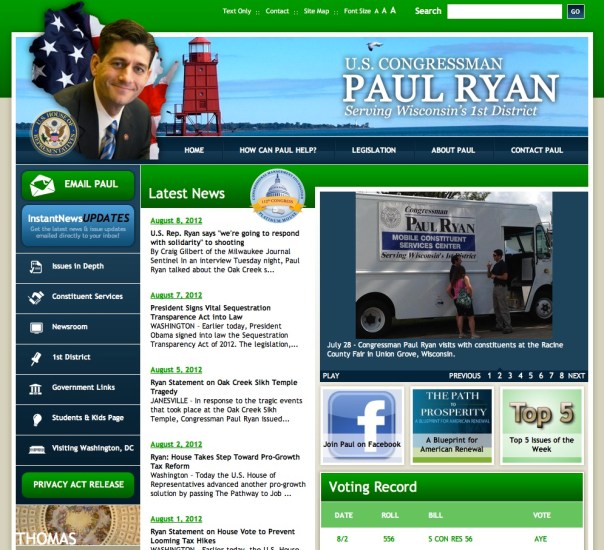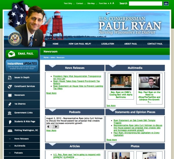 Mitt Romney made it official six days ago, but there is still no mention of this pretty major development to his constituents in Wisconsin on his official Congress homepage, as you can see here, or in the screenshot above.