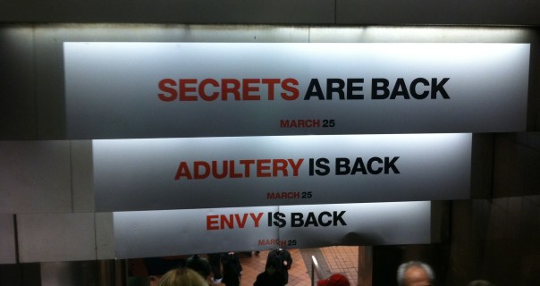 Mad Men’s fourth season concluded a year and a half ago, and the run-up to its fifth season premiere on March 25th is well under way now: Banana Republic is trying to convince you to dress like a Don Draper look-alike, and there have been various ads all over town for the show. The latter present a jump-off point for a discussion of advertising, culture, and values.
